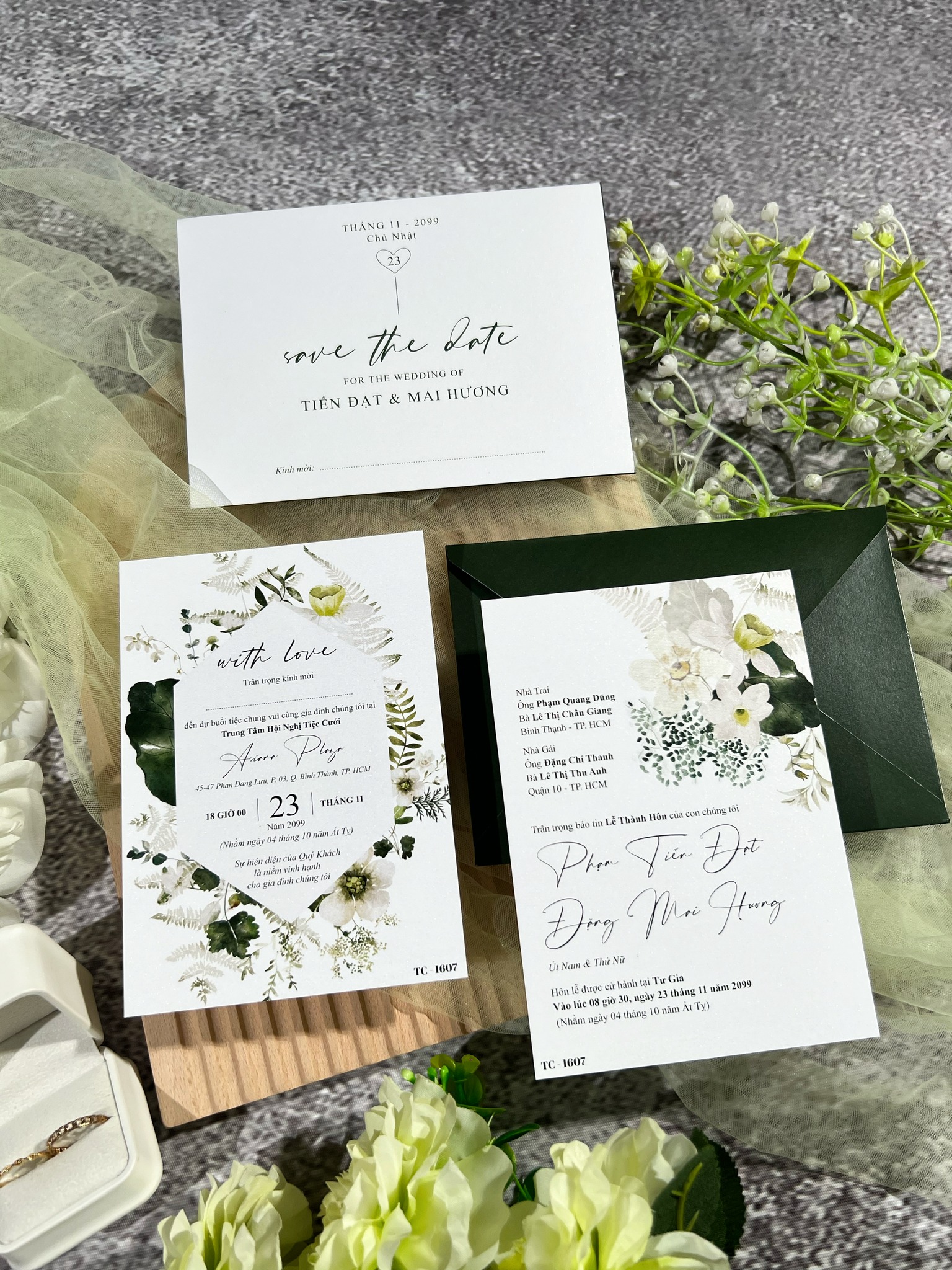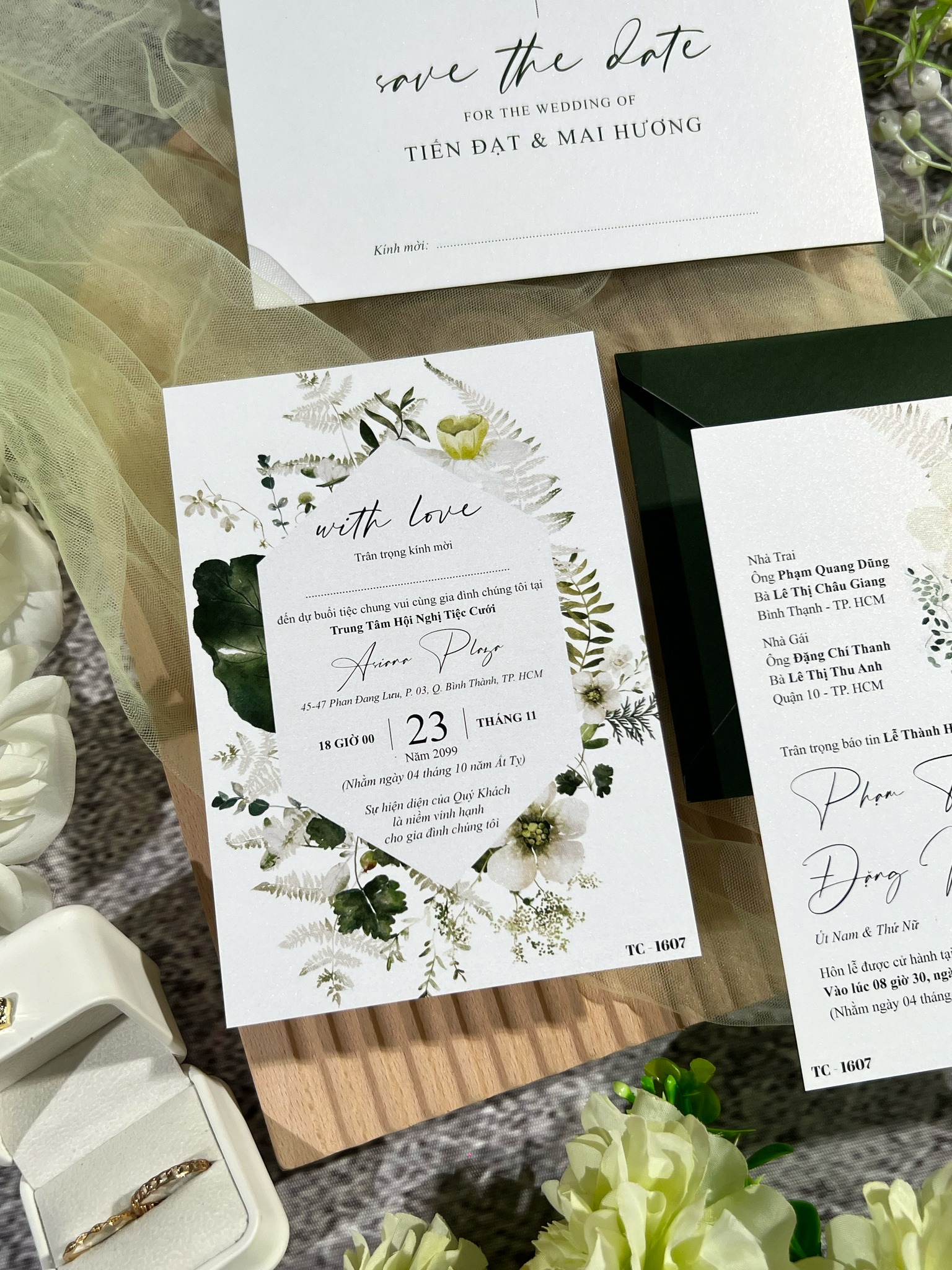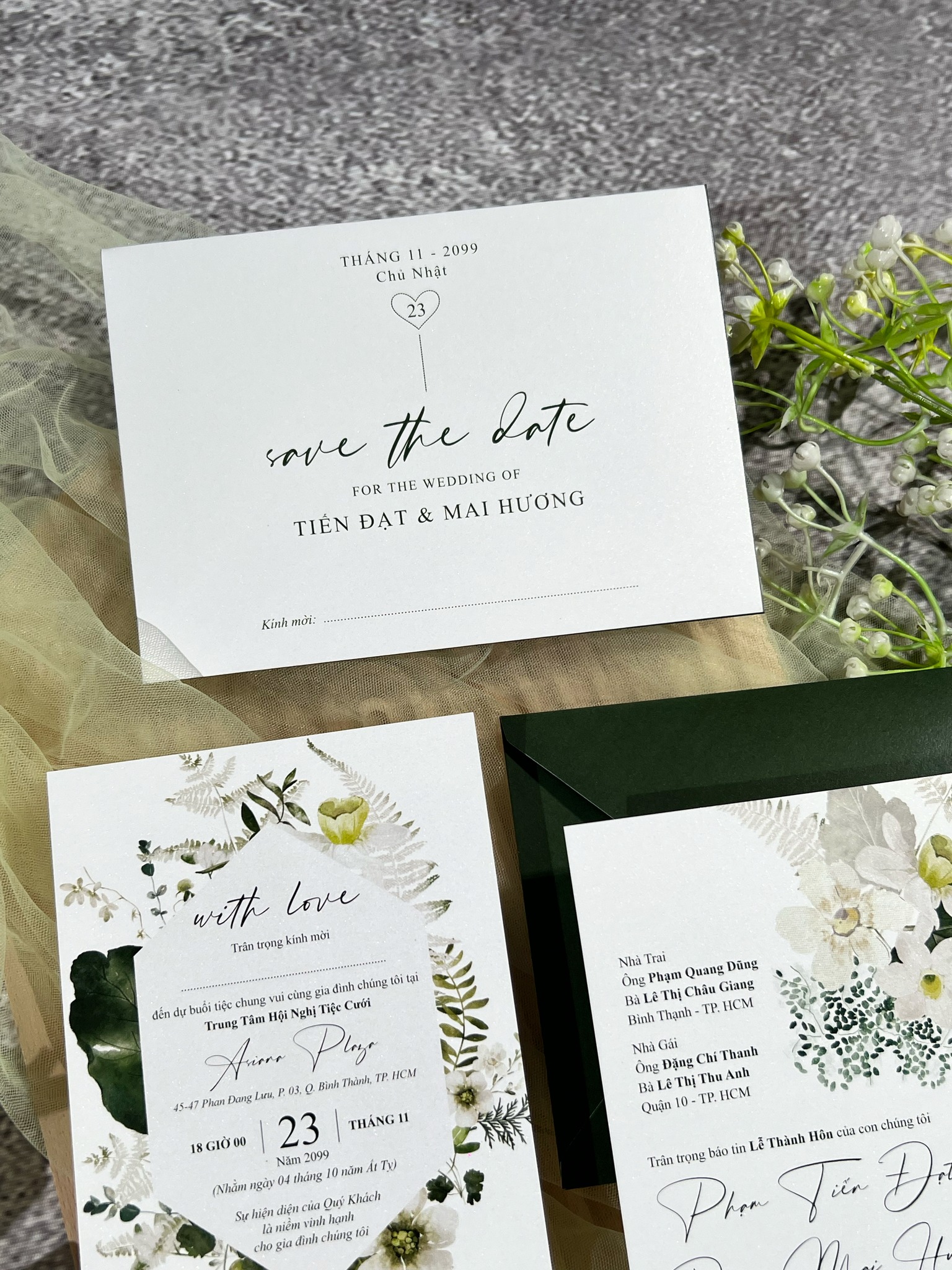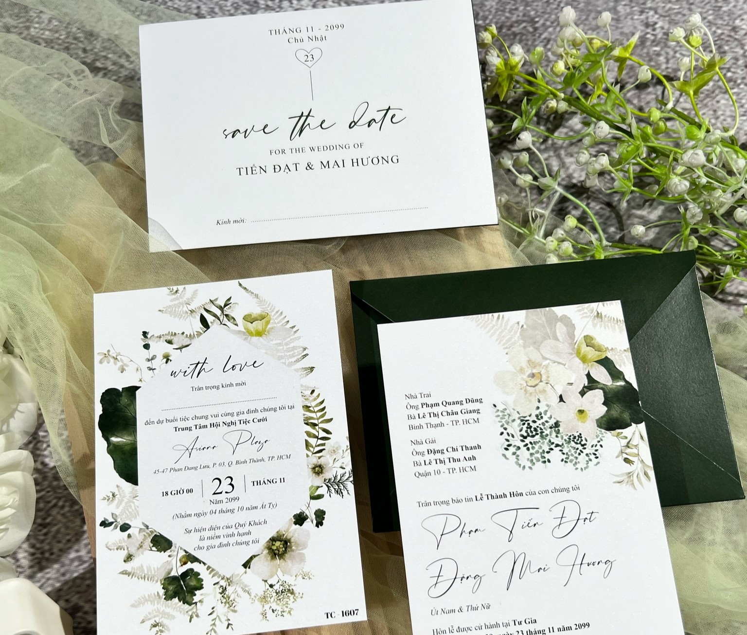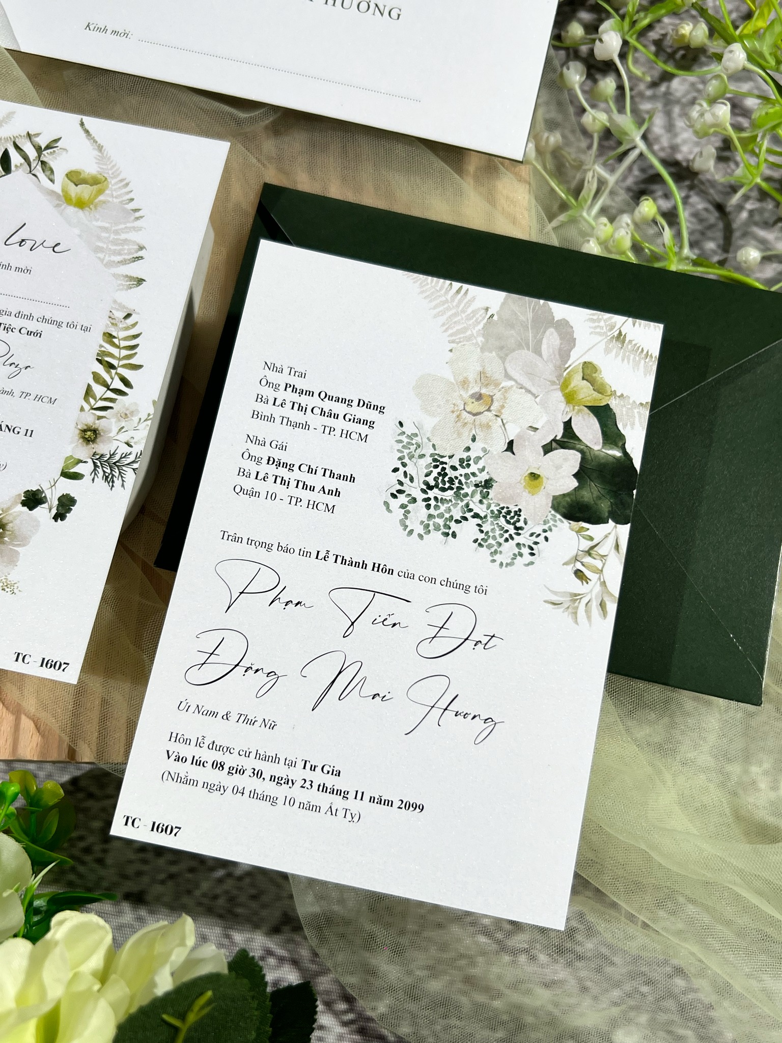 Mẫu thiệp "Hoa Lá Phong Lan Tinh Tế" khắc họa vẻ đẹp bất tận từ thiên nhiên với những đóa phong lan trắng ngần kiêu sa, điểm xuyết cùng cành lá xanh tươi mơn mởn. Thiết kế kết hợp hài hòa giữa nét vẽ watercolor mềm mại và bố cục hiện đại, tạo nên ấn tượng thị giác thanh lịch, gợi cảm giác bình yên và khởi sắc. Đường nét uyển chuyển của font chữ viết tay kết hợp cùng font chữ hiện đại, tối giản, mang đến sự cân bằng hoàn hảo giữa truyền thống và đương đại. Tông màu trắng và xanh lá chủ đạo không chỉ thể hiện sự tinh khôi mà còn truyền tải thông điệp về một tình yêu bền vững, tràn đầy sức sống.