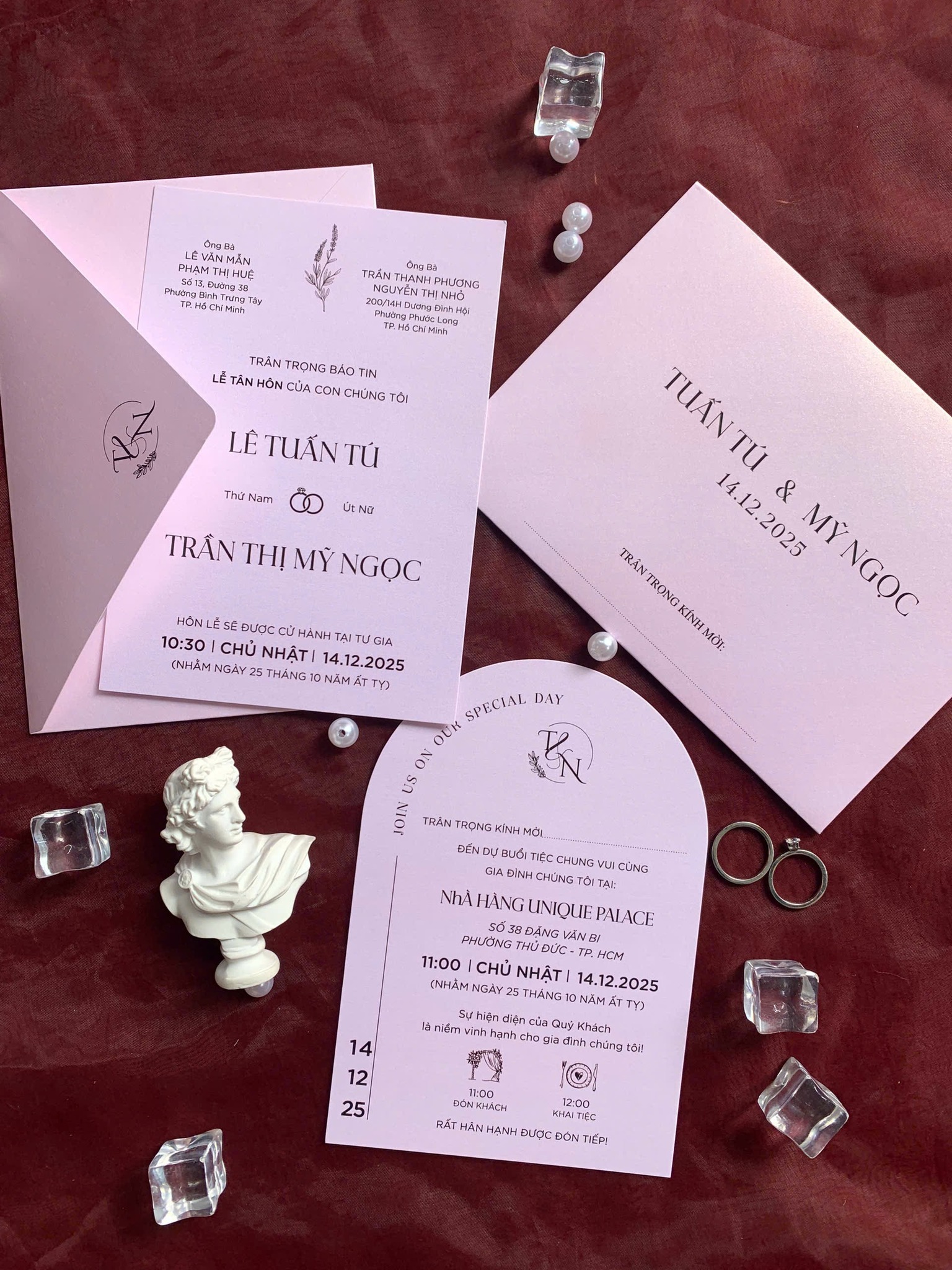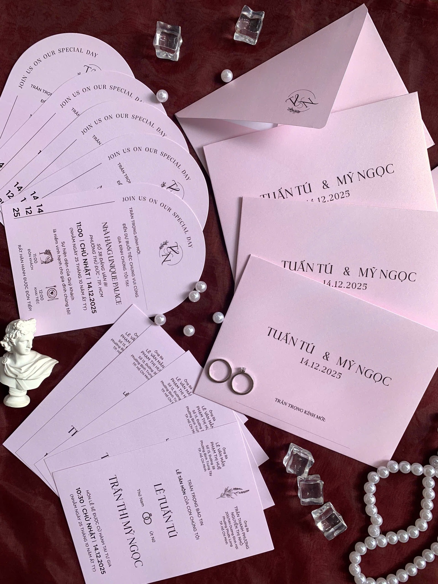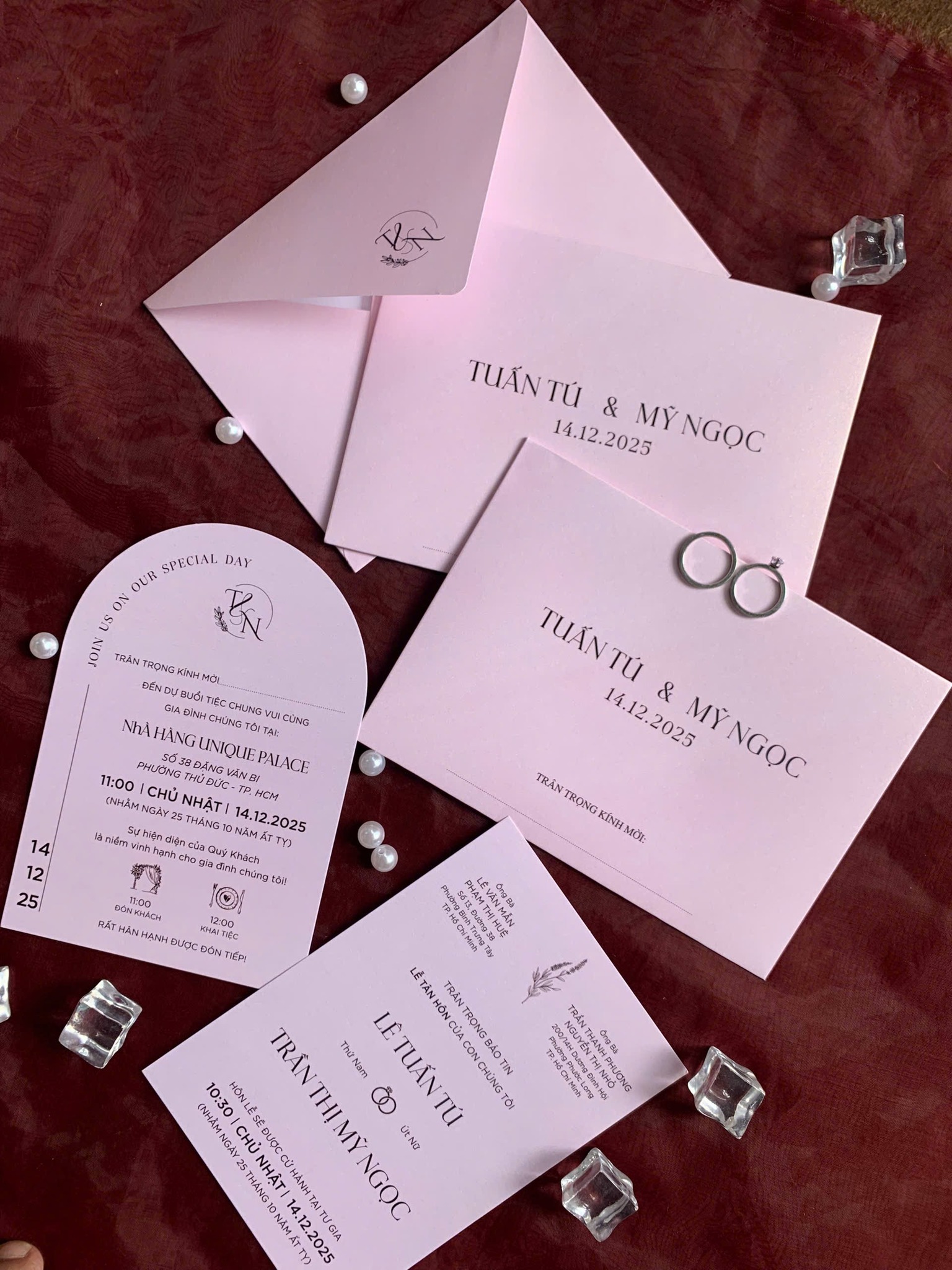 Thiết kế tập trung vào sự tối giản nhưng không đơn điệu. Bố cục được sắp xếp khéo léo, kết hợp hài hòa giữa font chữ sans-serif hiện đại cho thông tin chính và một chút nét viết tay thanh lịch cho các chi tiết nhấn nhá. Đặc biệt, các thẻ thông tin phụ hình quạt độc đáo là điểm nhấn ấn tượng, tạo sự khác biệt và thu hút ngay từ cái nhìn đầu tiên. Bao thư được thiết kế đồng bộ với thiệp, điểm xuyết bằng logo monogram cá nhân hóa, khẳng định dấu ấn riêng của cặp đôi.