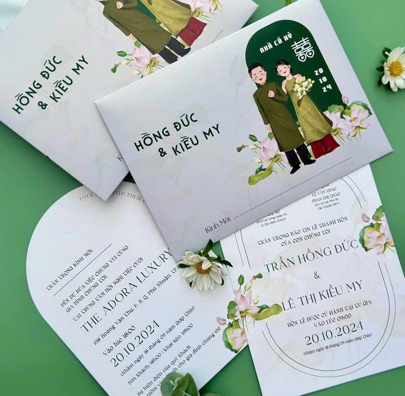 - EMERALD LOTUS: NÉT DUYÊN DÁNG TRUYỀN THỐNG – THIẾP CƯỚI ÁO DÀI VÀ HOA SEN Thiệp cưới Emerald Lotus là sự kết hợp hài hòa giữa bản sắc truyền thống và nghệ thuật đồ họa hiện đại. Thiết kế nổi bật với hình minh họa cô dâu chú rể mặc áo dài và họa tiết Hoa Sen, trên nền tông màu Xanh Ngọc Bích và Trắng Kem. Đây là lựa chọn trang trọng, tinh tế, khẳng định gu thẩm mỹ có chiều sâu văn hóa.