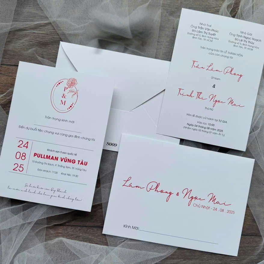 Thiệp cưới "Sắc Đỏ Tình Duyên" được thiết kế dành riêng cho các cặp đôi yêu thích vẻ đẹp vượt thời gian, nơi sự nồng nàn của tình yêu được thể hiện qua sắc đỏ rực rỡ, hòa quyện trên nền trắng tinh khôi. Đây là lựa chọn lý tưởng cho một đám cưới trang trọng, ấm cúng và đầy lãng mạn, ghi dấu ấn khó quên trong lòng mỗi vị khách mời.