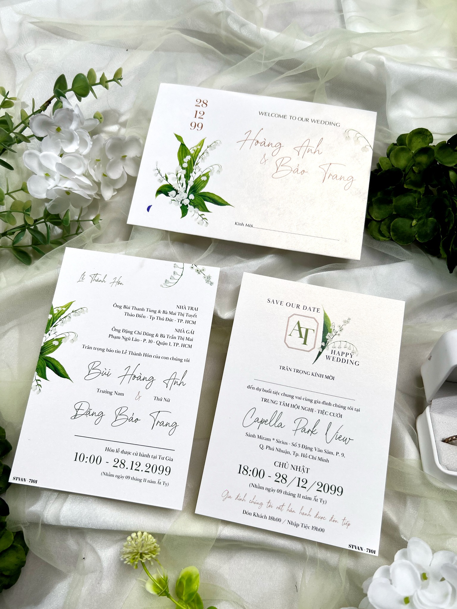 - Thiệp cưới Hoa Linh Lan là sự kết hợp hoàn hảo giữa nét hiện đại và tinh tế. Lấy cảm hứng từ loài hoa linh lan trắng – biểu tượng của hạnh phúc vĩnh cửu, mẫu thiệp mang đến cảm giác trong trẻo, thanh khiết và tràn đầy yêu thương.
