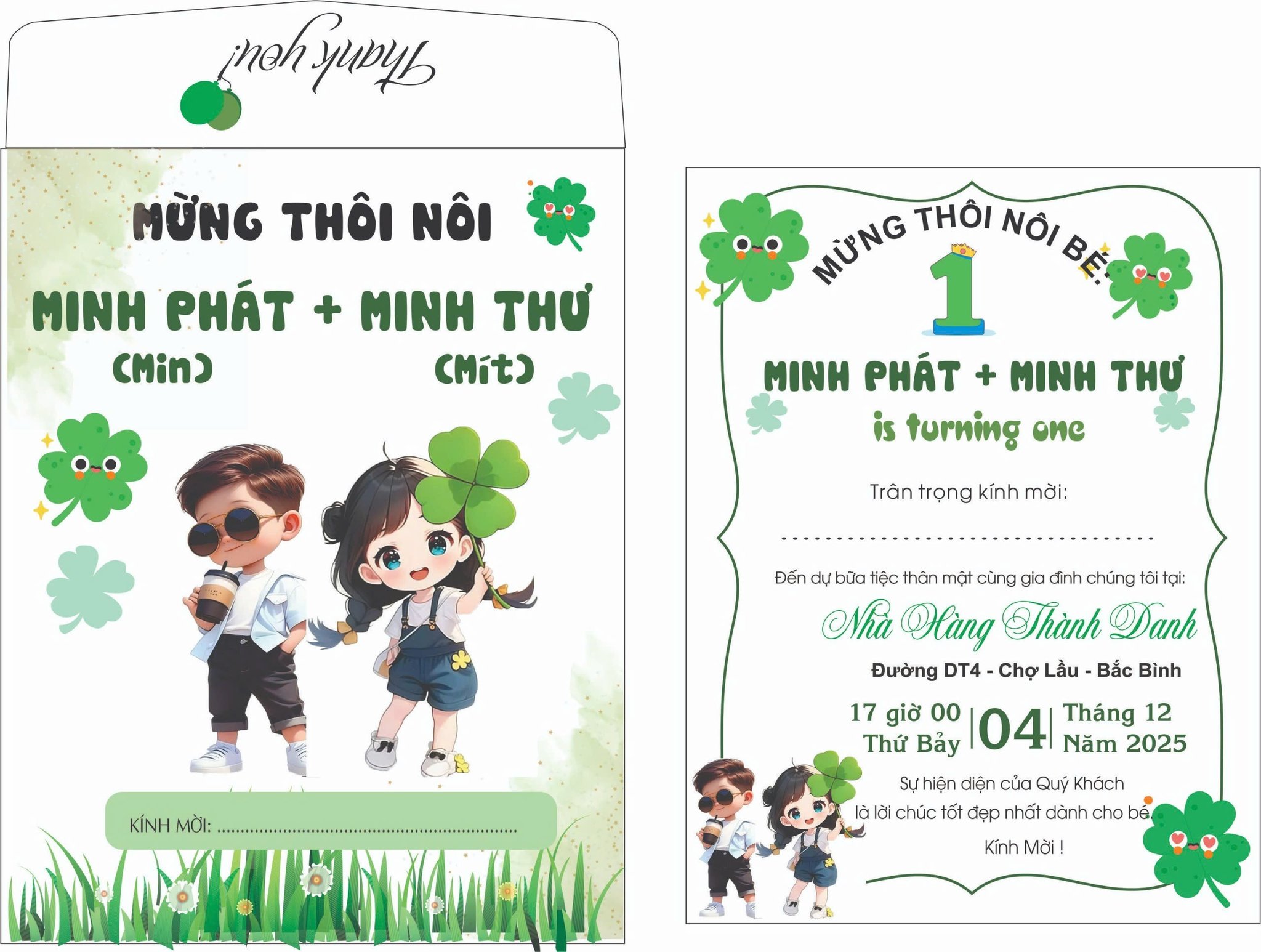 - THIỆP THÔI NÔI CẶP ĐÔI CỎ BA LÁ XANH MÁT – KHỞI ĐẦU BÌNH AN VÀ MAY MẮN Mẫu thiệp thôi nôi "Cặp Đôi Cỏ Ba Lá Xanh Mát" là lựa chọn hoàn hảo để kỷ niệm sinh nhật đầu tiên của bé, mang đến vẻ đẹp tươi mới, tinh tế và tràn đầy ý nghĩa may mắn.