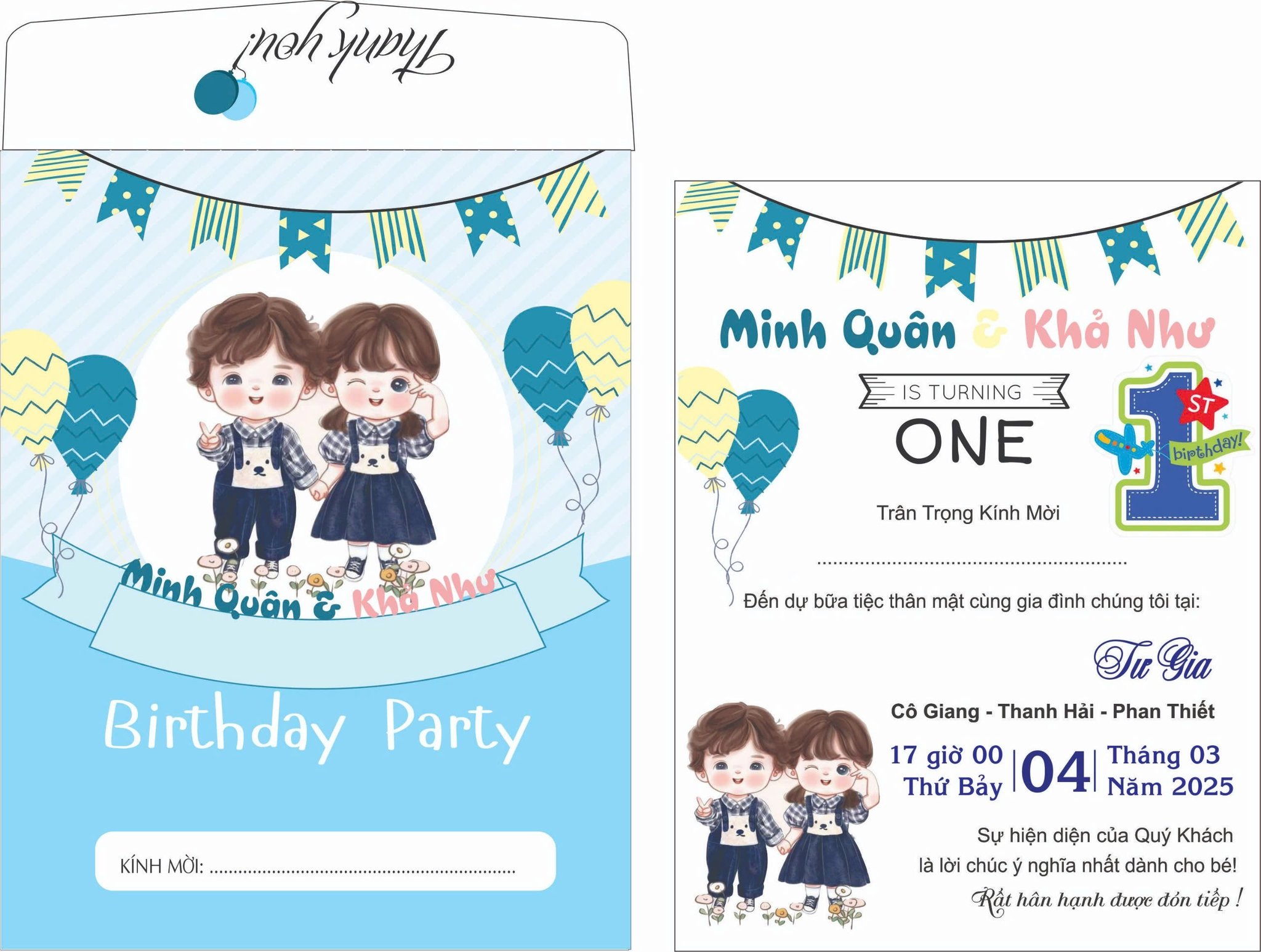 Ngày bé yêu tròn một tuổi là một cột mốc vàng son, tràn ngập hạnh phúc và ý nghĩa. Mẫu thiệp thôi nôi Song Sinh Bình An từ Thiệp Cưới Đồng Xoài được thiết kế riêng biệt, gửi gắm trọn vẹn tình yêu thương và lời chúc tốt đẹp nhất cho khoảnh khắc đặc biệt này của gia đình. Với phong cách hiện đại, tươi sáng và ngập tràn tình yêu thương, thiệp phù hợp với buổi tiệc thôi nôi ấm cúng của bé.