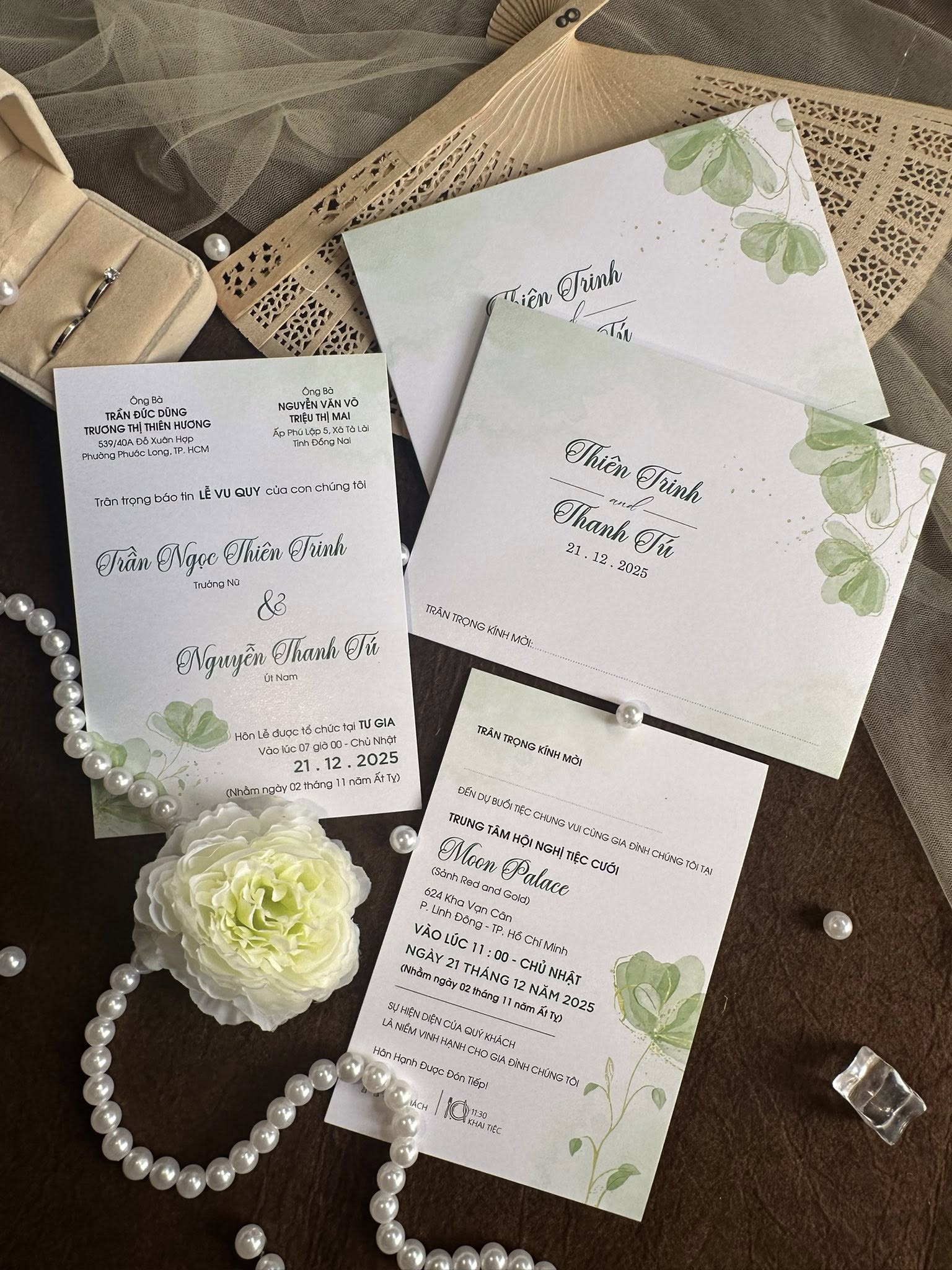 Phong cách thiết kế này đặc trưng bởi sự tối giản, tập trung vào vẻ đẹp tự nhiên và sự thanh lịch. Font chữ được lựa chọn kỹ càng, vừa mềm mại vừa rõ ràng, làm nổi bật thông điệp hạnh phúc mà bạn muốn gửi gắm đến khách mời. Thiệp Lá Xanh Thủy Mặc không chỉ là một lời mời mà còn là một kỷ niệm đáng giá, thể hiện gu thẩm mỹ tinh tế của cặp đôi.