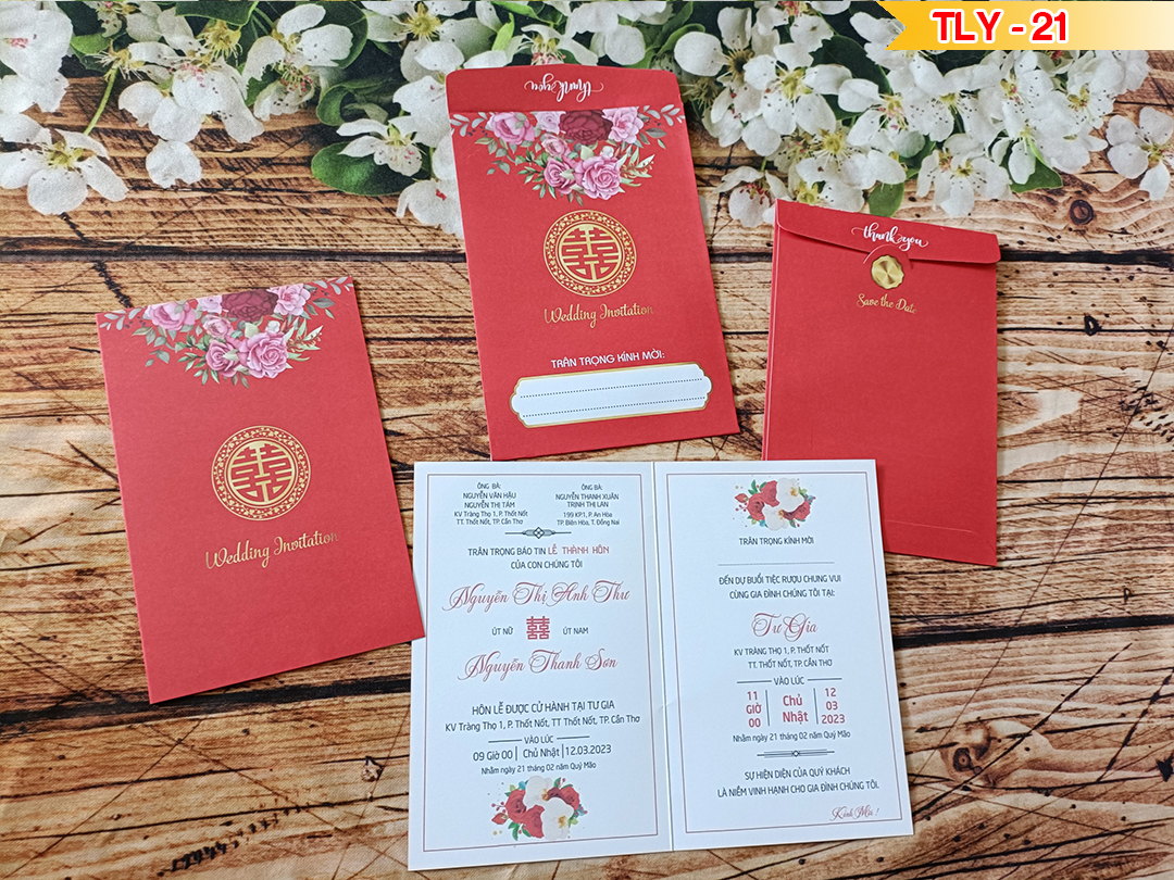 - Mẫu phôi thiệp cưới offset giá rẻ màu Đỏ hỷ kiểu đứng lớn Mã TLY-21 Bao thư in offset 1 mặt đã dán sẵn, kích thước 12×17,5cm ruột gấp in offset 1 mặt, kích thước 17x22cm - Tặng 100 thiệp nhóm họ khi in từ 500 thiệp trở lên - Nhận trang trí gia tiên - Boook thợ chụp tiệc giảm trực tiếp 200k trên tổng dịch vụ. - Liên hệ Hotline, Zalo 0389 585 590 - 0979547489 để được tư vấn trực tiếp.