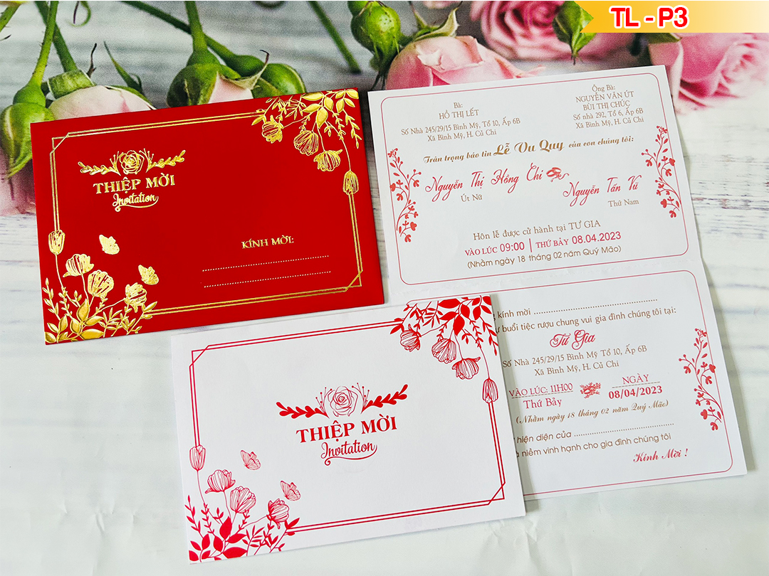 • Mẫu thiệp truyền thống đỏ nhung kiểu ngang nắp chéo ép kim vàng họa tiết hoa và thiệp mời mã TLP-3 kích thước bao thư dán sẵn: 18,5×12,5cm ruột gấp đôi in offset 1 mặt