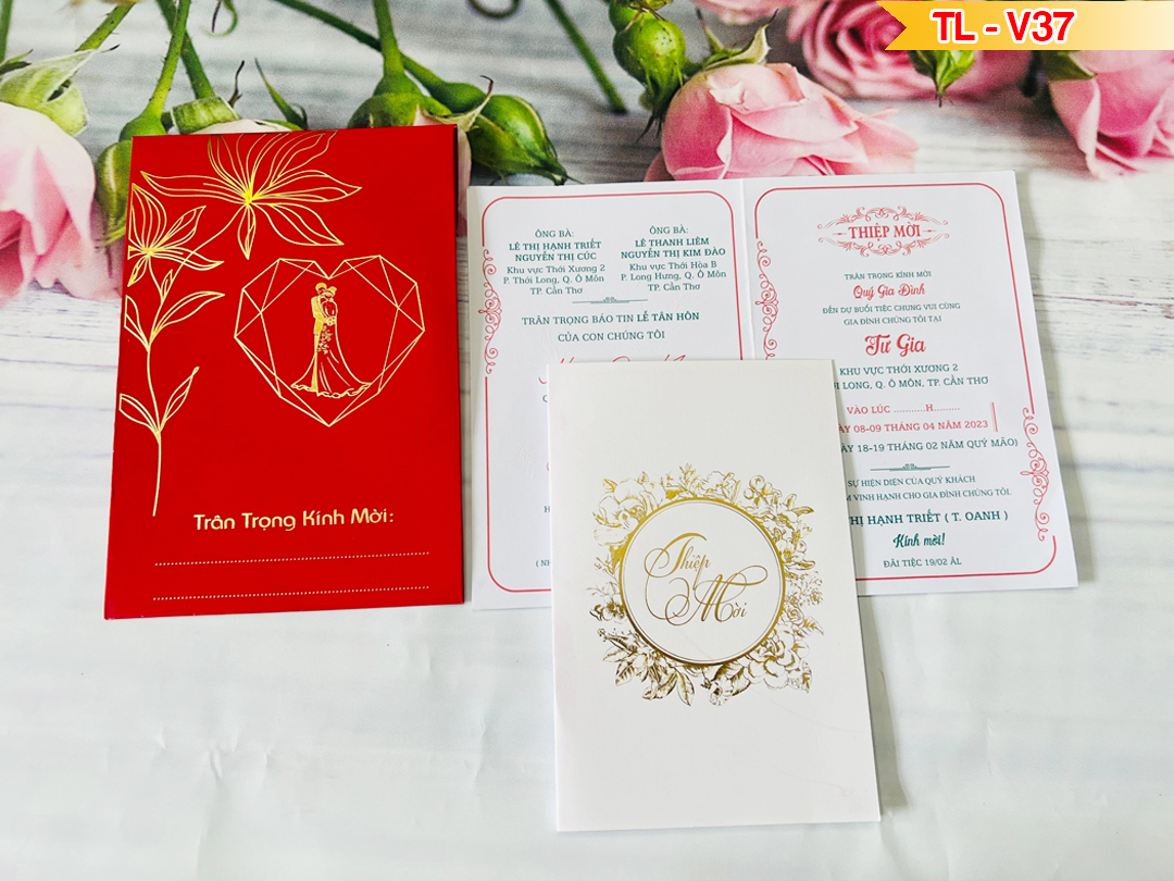 - Mẫu thiệp truyền thống đỏ nhung kiểu đứng lớn, Ép kim vàng dâu rể mã TLV-37 kích thước bao thư dán sẵn: 12,5×17,5cm ruột gấp đôi ép kim 1 mặt