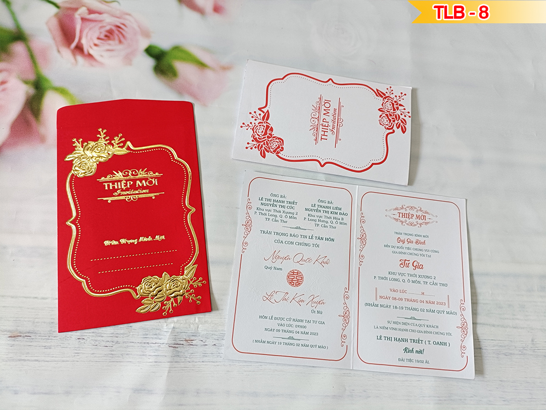 Mẫu phôi thiệp cưới đỏ nhung đứng trung ép kim vàng mã TLB-8 kích thước bao thư dán sẵn: 12×17,5cm ruột gấp đôi in offset 1 mặt