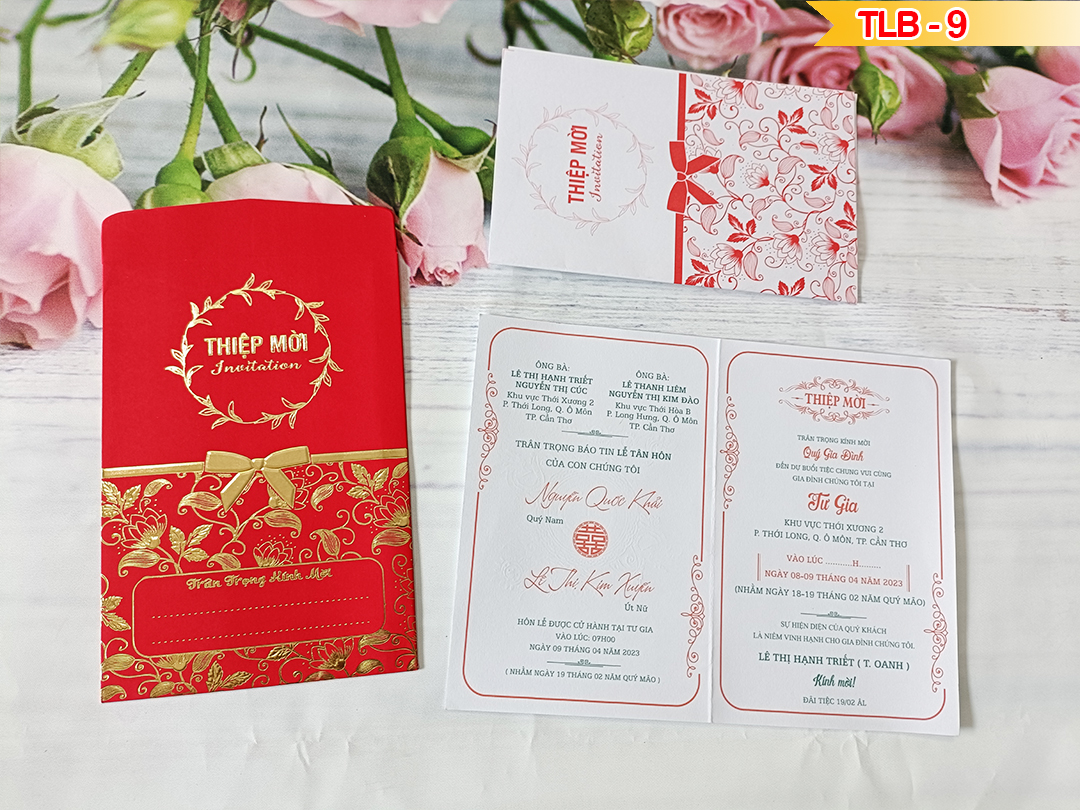 Mẫu phôi thiệp cưới đỏ nhung đứng trung ép kim vàng mã TLB-9 kích thước bao thư dán sẵn: 12×17,5cm ruột gấp đôi in offset 1 mặt
