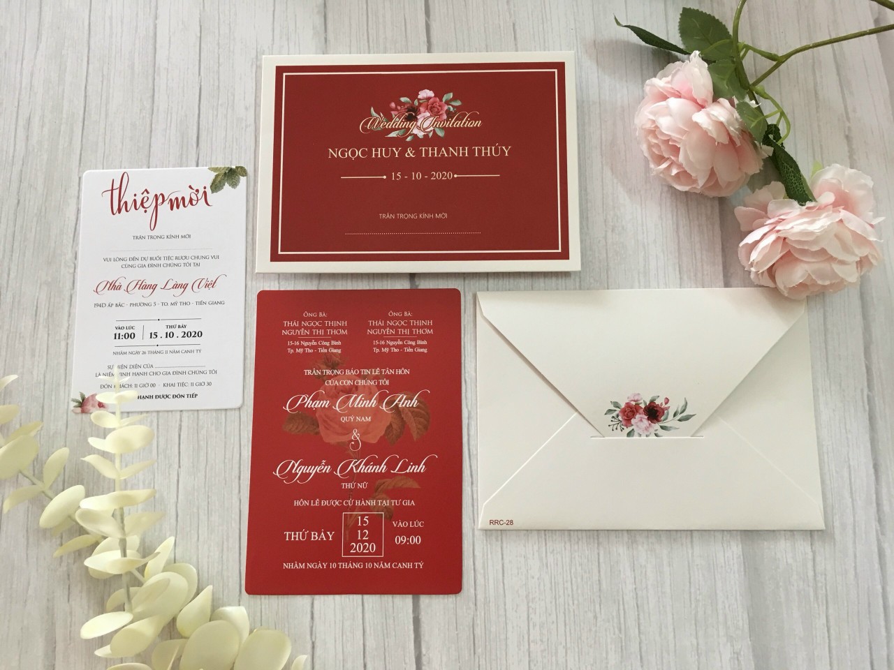 Mức giá in thiệp cưới KTS hoàn thiện phụ thuộc vào kiểu in, giấy in, gia công thêm ép kim, đóng mắc cáo, thêm các chi tiết nếu có.