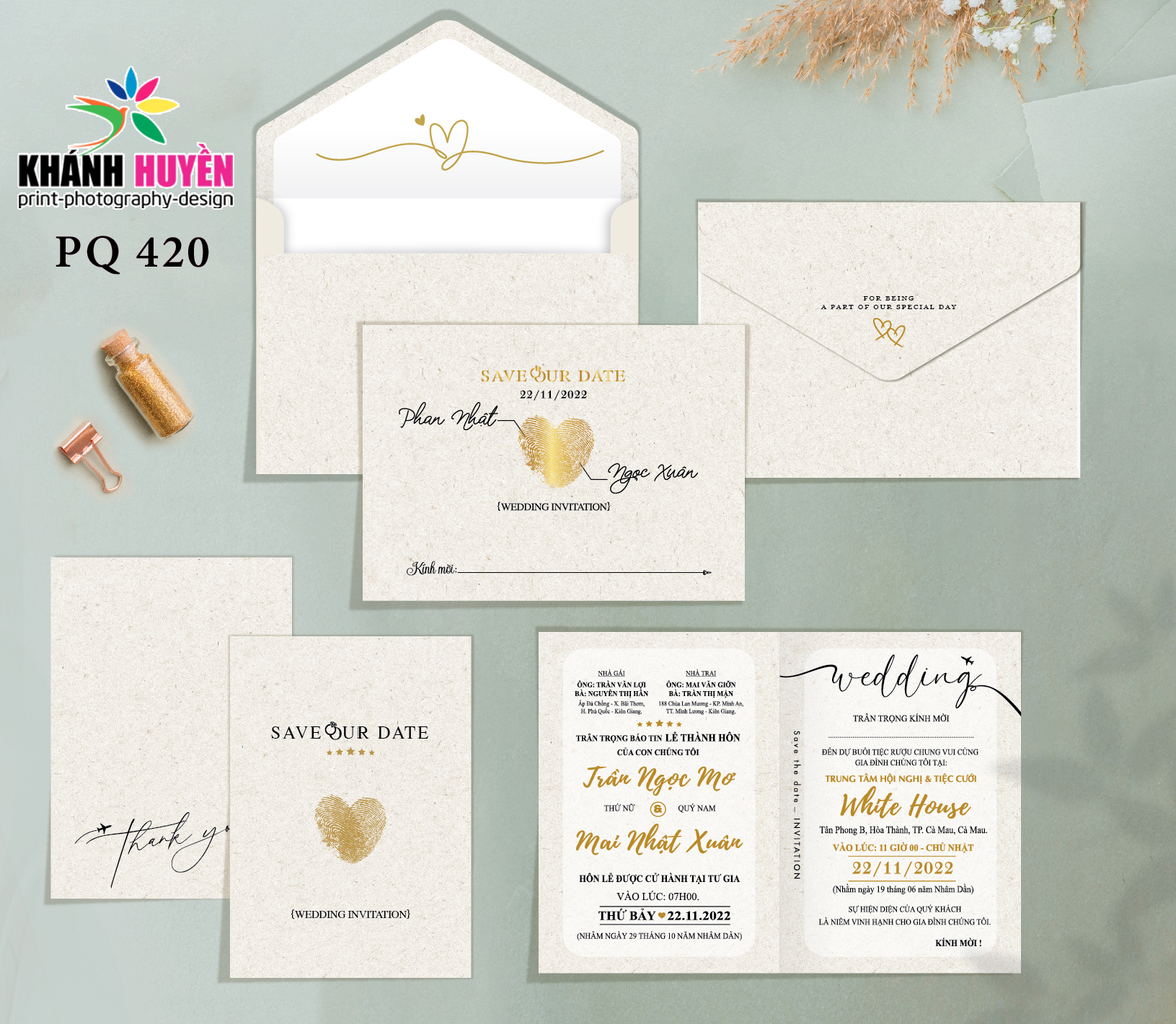 Thiệp Cưới Đồng Xoài ( Xưởng In Khánh Huyền) thiết kế và in theo từng đơn hàng Dâu Rể đặt, Thiệp in hoàn thiện gồm bao thư + ruột + phụ kiện nếu có đã in, dán thành phẩm. Công nghệ in KTS in trên máy in nhanh công nghiệp hiệu Konica/ Ricoh mực laser in theo giấy in thông …