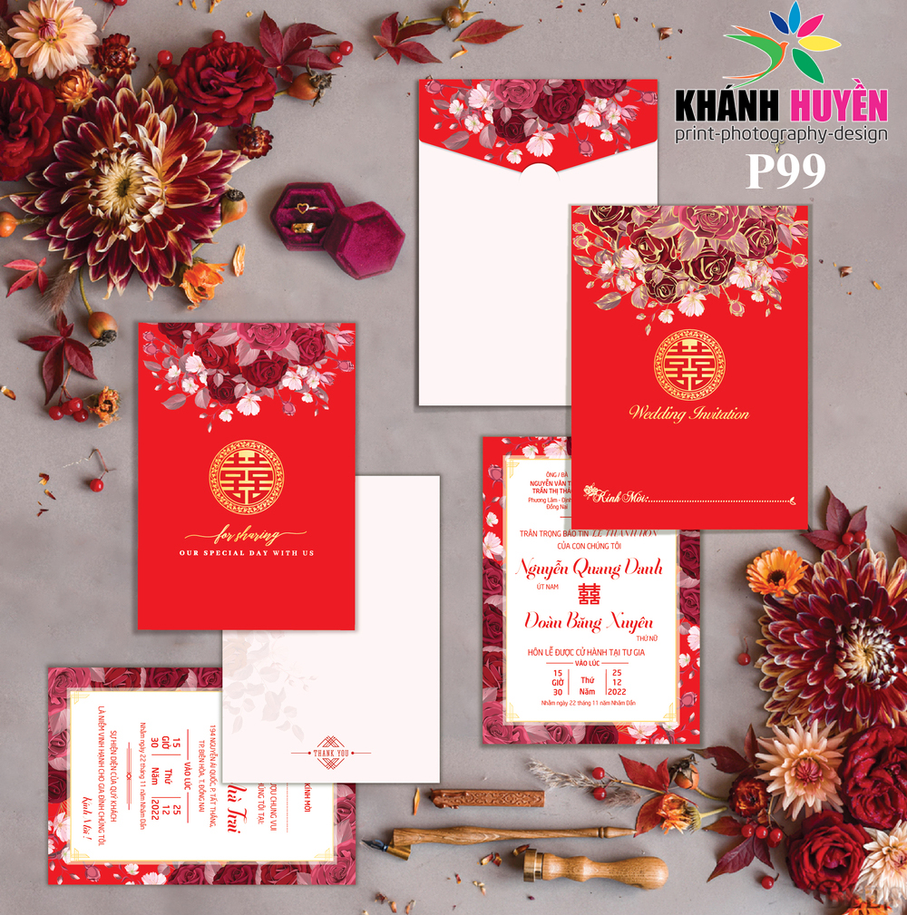 Thiệp Cưới Đồng Xoài ( Xưởng In Khánh Huyền) thiết kế và in theo từng đơn hàng Dâu Rể đặt, Thiệp in hoàn thiện gồm bao thư + ruột + phụ kiện nếu có đã in, dán thành phẩm.