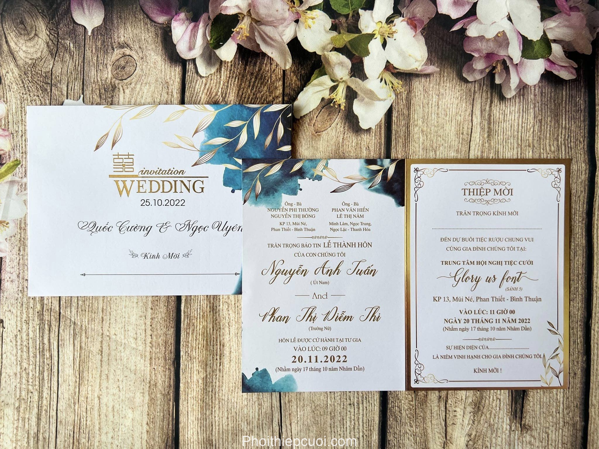 Phôi Thiệp cưới in offset Xanh kem ép kim vàng cao cấp mã TLP-135 Giấy định lượng dày in offset + ép kim họa tiết trên bao thư Thiệp kiểu hình chữ nhật ngang lớn, nắp chéo Kích thước bao thư thành phẩm đã dán sẵn 13x18cm Ruột đôi in offset họa tiết 2 mặt