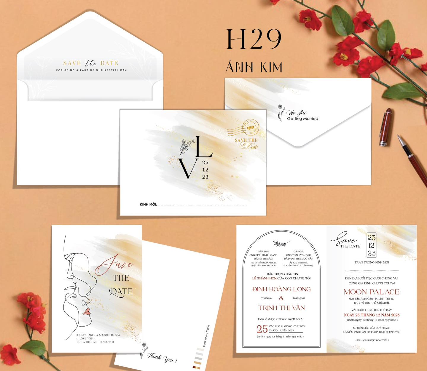 Thiệp Cưới Đồng Xoài ( Xưởng In Khánh Huyền) thiết kế và in theo từng đơn hàng Dâu Rể đặt, Thiệp in hoàn thiện gồm bao thư + ruột + phụ kiện nếu có đã in, dán thành phẩm.