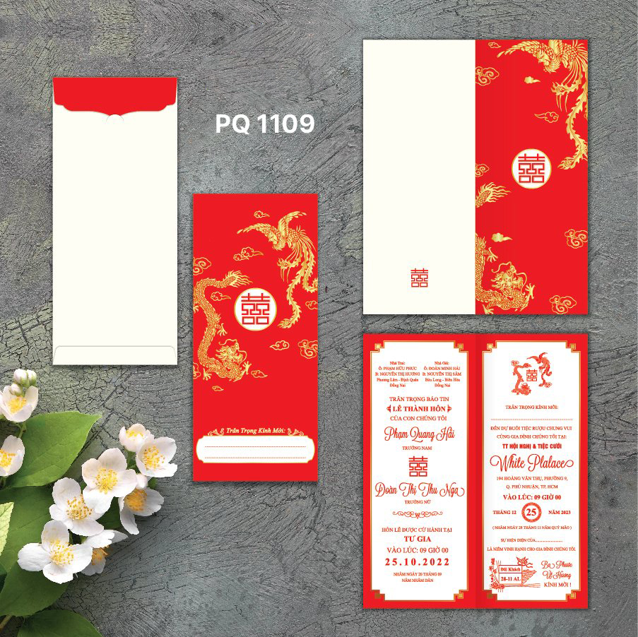 Thiệp Cưới Đồng Xoài ( Xưởng In Khánh Huyền) thiết kế và in theo từng đơn hàng Dâu Rể đặt, Thiệp in hoàn thiện gồm bao thư + ruột + phụ kiện nếu có đã in, dán thành phẩm.