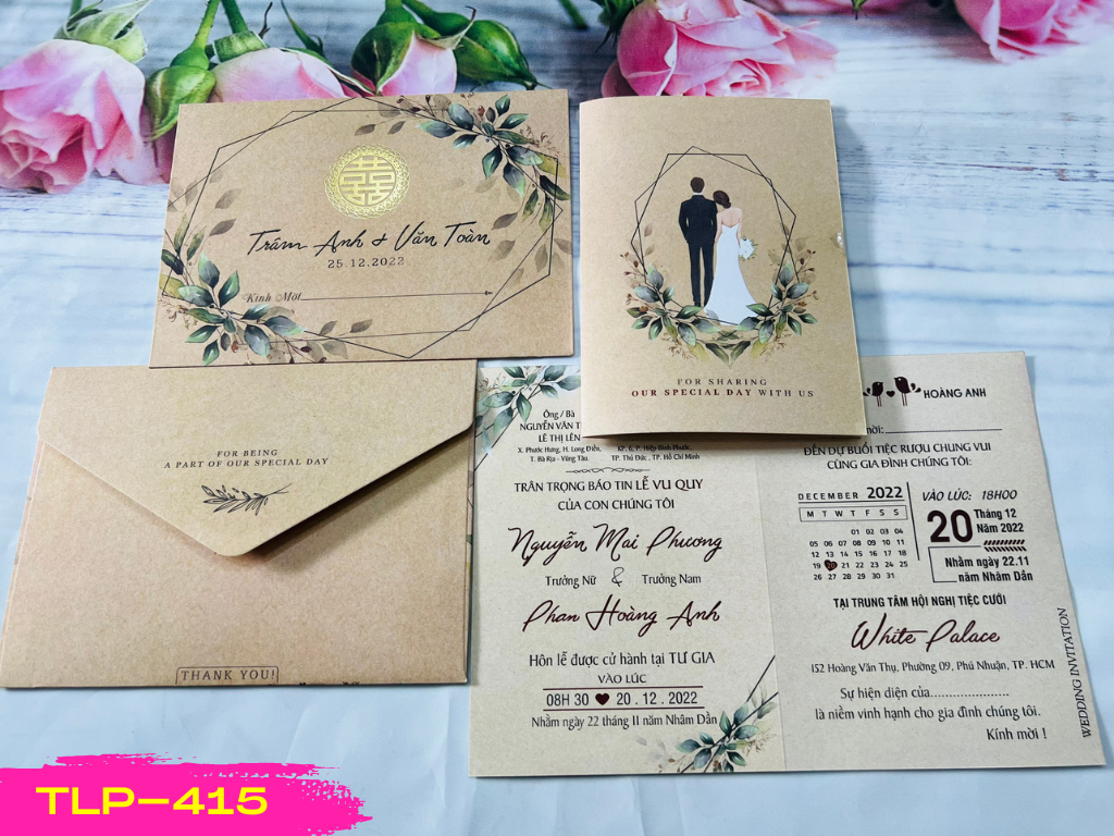 - Mẫu phôi thiệp cưới Gỗ vintage chipi dâu rể + ép kim vàng mã TLP-415 Đây là dòng thiệp ép kim sang trọng, giấy kem mỹ thuật dày, ruột và bao thư Bao thư đã dán sẵn thành phẩm in offset 2 mặt và ép kim Ruột gấp 1 tờ in offset 2 mặt Kích thước bao thư khổ ngang 13x18cm, ruột kt 22,5x 16cm