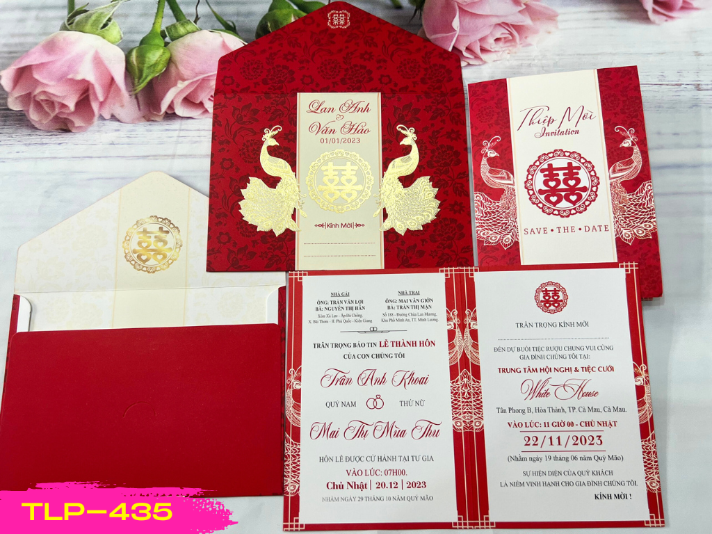 - Mẫu phôi thiệp cưới Đỏ đô vân chìm khổng tước ép kim vàng mã TLP-435 Đây là dòng thiệp ép kim sang trọng, giấy kem mỹ thuật dày, ruột và bao thư Bao thư đã dán sẵn thành phẩm in offset 2 mặt và ép kim Ruột gấp 1 tờ in offset 2 mặt Kích thước bao thư khổ ngang 13x18cm, ruột kt 22,5x 16cm