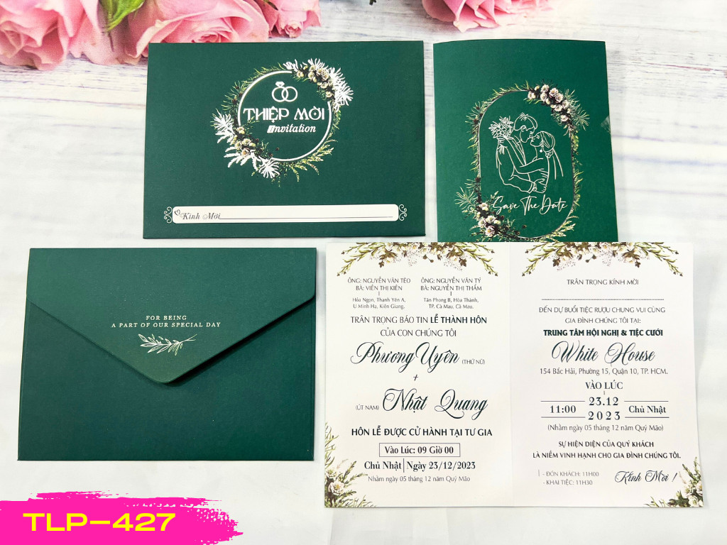 Mẫu phôi thiệp cưới XANH lá đậm vòng hoa offset ép kim bạc nhẫn cưới mã TLP-427