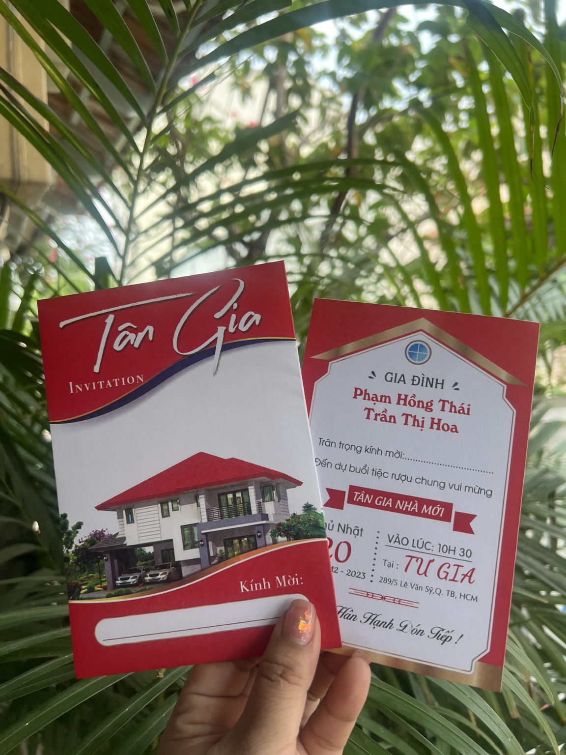 - Mẫu phôi thiệp mời tân gia đỏ offset nhà thái, màu đỏ, xanh dương, Gỗ Kích thước kiểu đứng 10.5 x16cm chất liệu: Giấy kem gân mỹ thuật Bao thư đã dán sẵn, ruột 1 tờ in offset