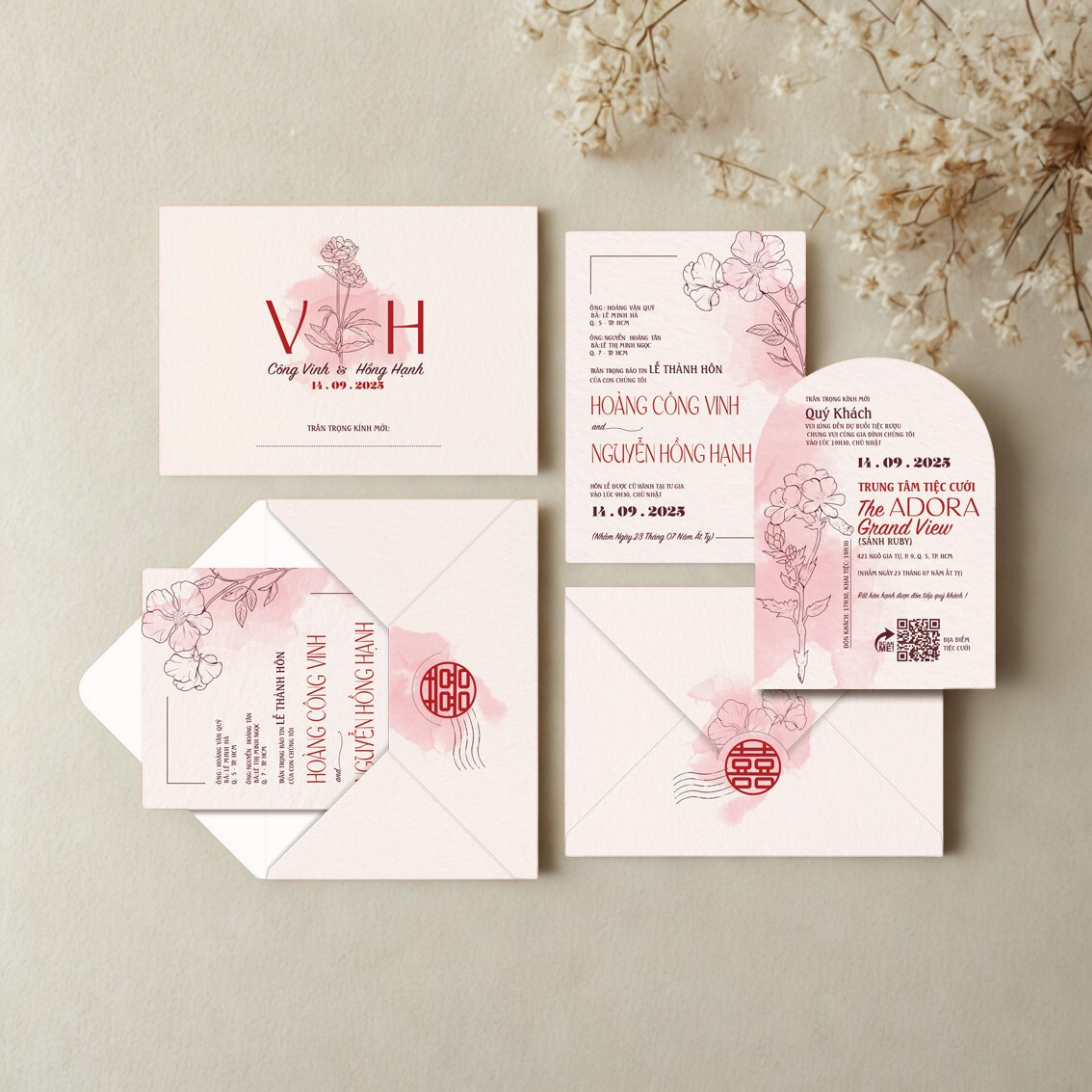 - THIỆP CƯỚI HOA LÁ NỀN HỒNG TINH TẾ – NÉT DUYÊN DÁNG CHO NGÀY HẠNH PHÚC
