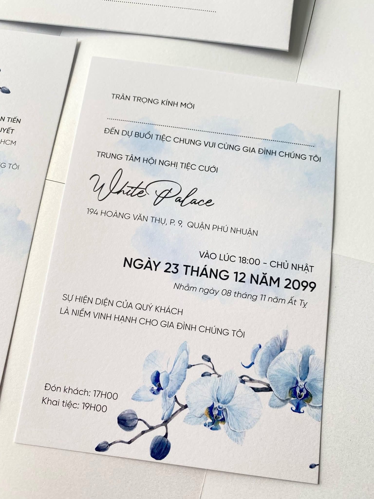 Mẫu thiệp cưới Blue Orchid Whisper được lấy cảm hứng từ sắc xanh nhẹ nhàng của hoa lan – biểu tượng của sự thuần khiết và khởi đầu hạnh phúc. Thiết kế tối giản, tinh tế với tông màu trắng – xanh pastel giúp tổng thể trở nên sang trọng và thanh lịch.