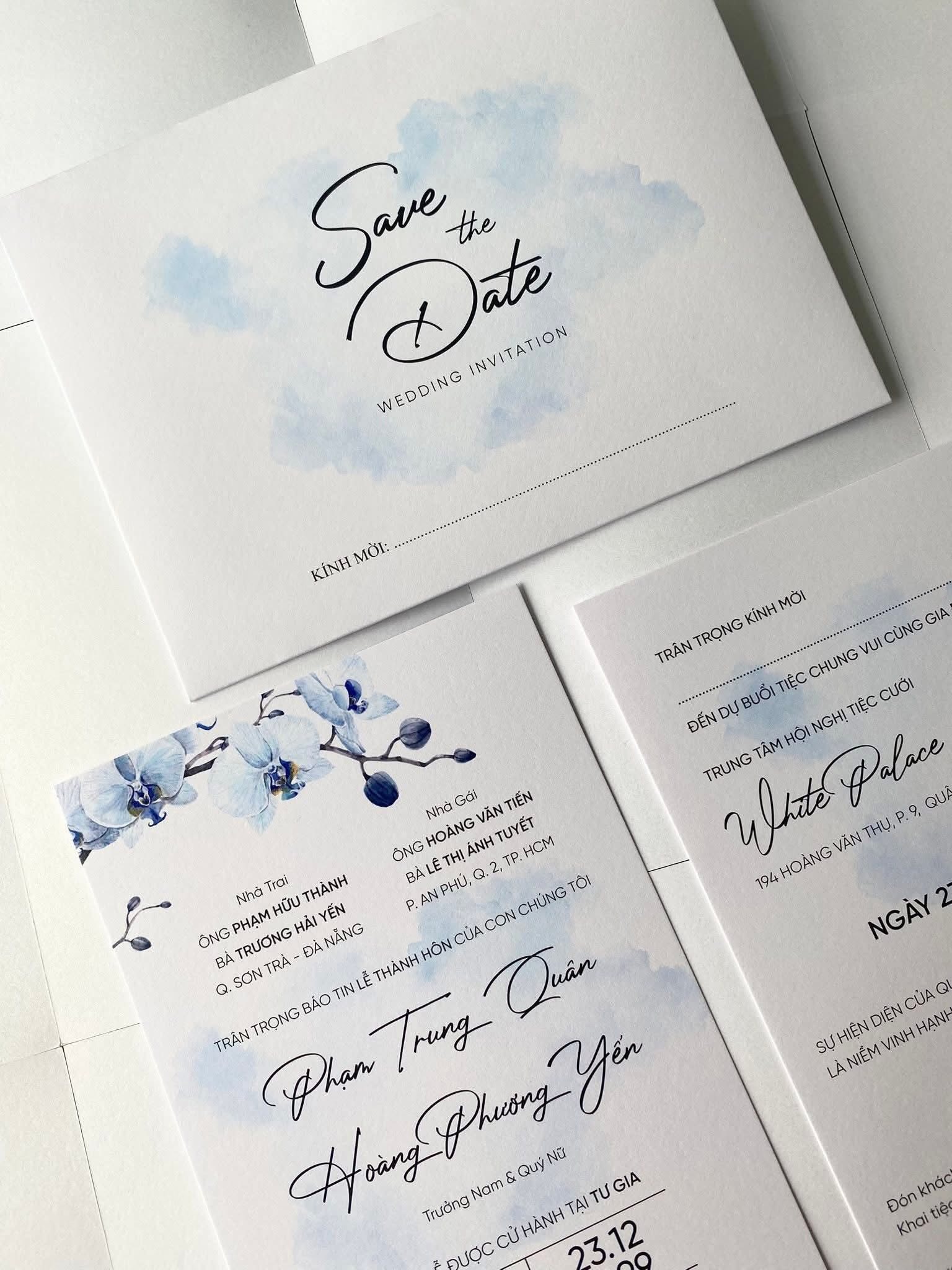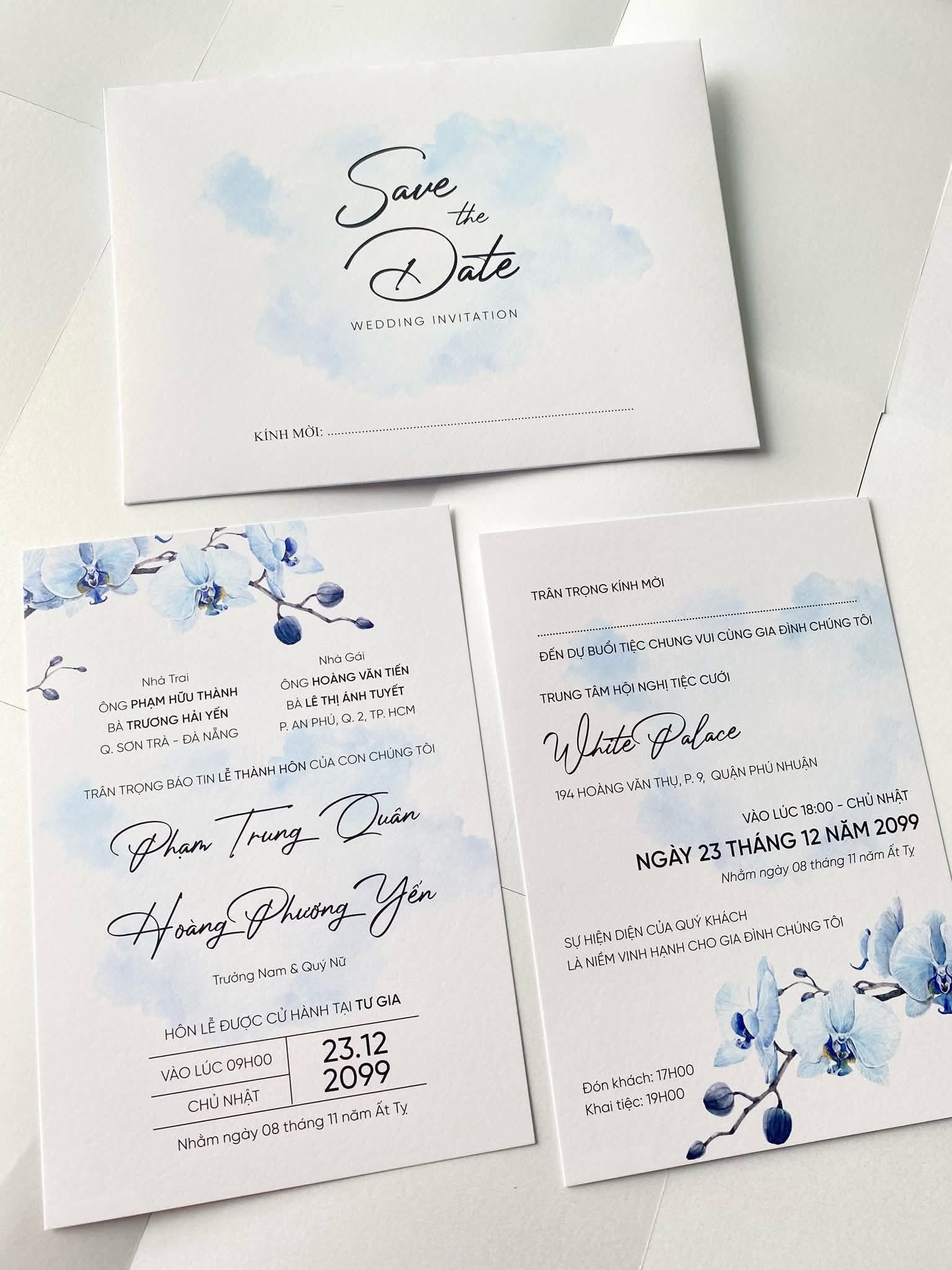 • Mẫu thiệp cưới Blue Orchid Whisper được lấy cảm hứng từ sắc xanh nhẹ nhàng của hoa lan – biểu tượng của sự thuần khiết và khởi đầu hạnh phúc. Thiết kế tối giản, tinh tế với tông màu trắng – xanh pastel giúp tổng thể trở nên sang trọng và thanh lịch.