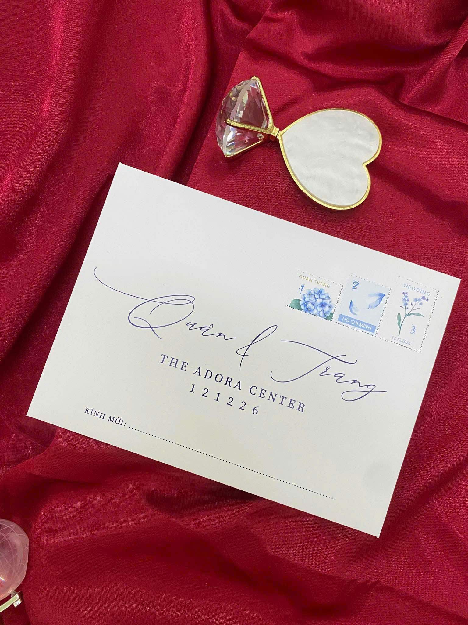 - Chất liệu Phong bì Cao cấp: Phong bì màu Trắng kem Ivory, định lượng dày, in chi tiết tên và địa điểm với độ sắc nét cao, thể hiện sự đầu tư chu đáo.